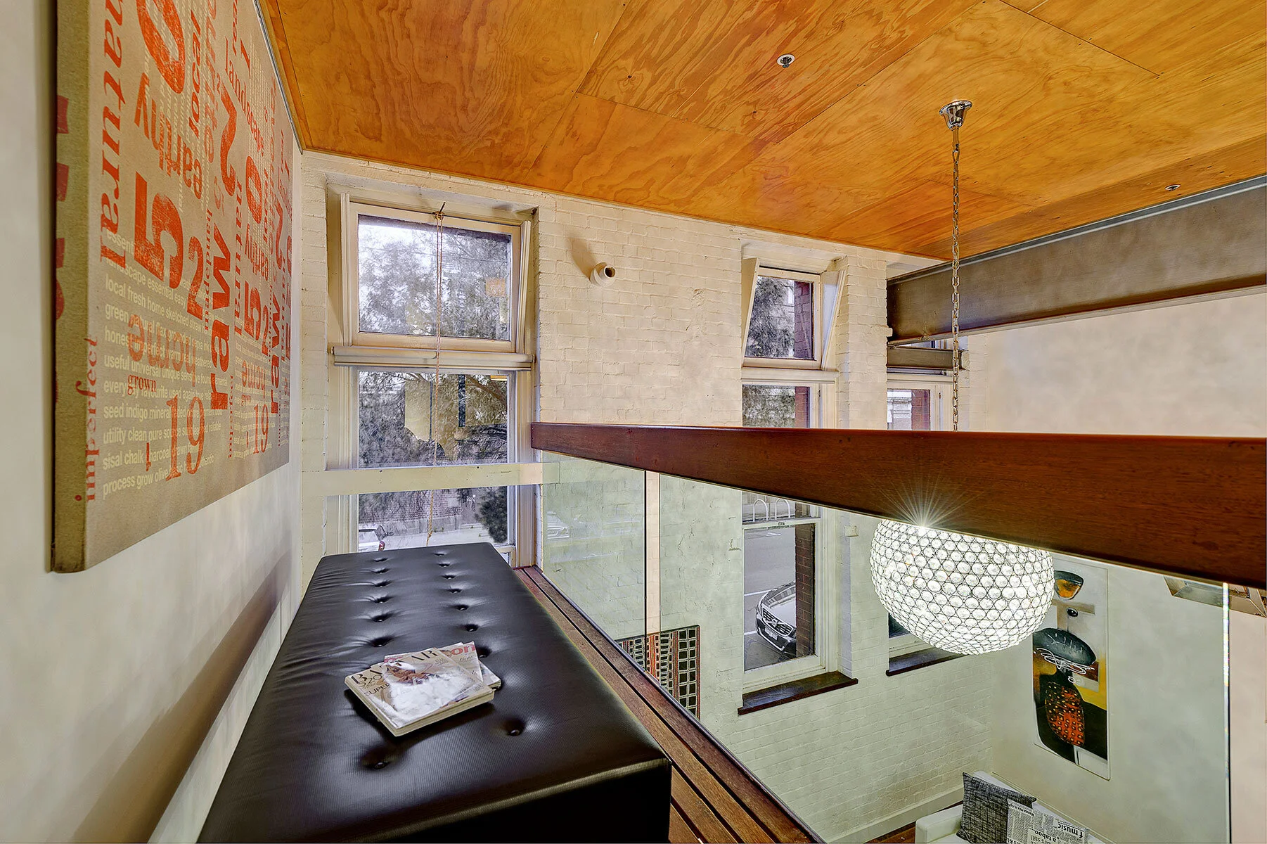 The solution was to insert a split mezzanine floor with exposed joists and voids located over the ground floor kitchen and lounge areas. The two full height spaces allow natural light to spill into the lower spaces from the large sash windows on Oxford Street and the courtyard/carpark to the south. Acces to the courtyard is off the mezzanine bridge via bifolding doors. The timber linings continue from the internal space to outside and serve to marry the internal and external spaces. The courtyard is a utility space for carpark, storage and entertaining and opens to the sky with an operable roof.